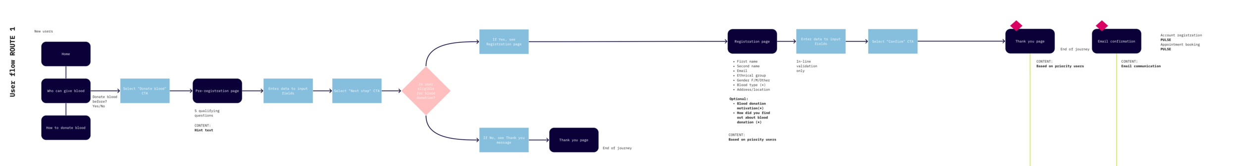 It was clear that the current process was heavily geared towards extracting eligibility criteria from the user to find out if the user was eligible to donate blood at all, blocking anyone with a history of cancer, blood transfusions, inappropriate age or weight. The user would then be prompted to open an account and could then attempt to find an appointment on the NHSBT site. This existing journey resulted in every new donor’s experience being treated the same past this point, regardless of how much of a priority blood type they might have behind the scenes.