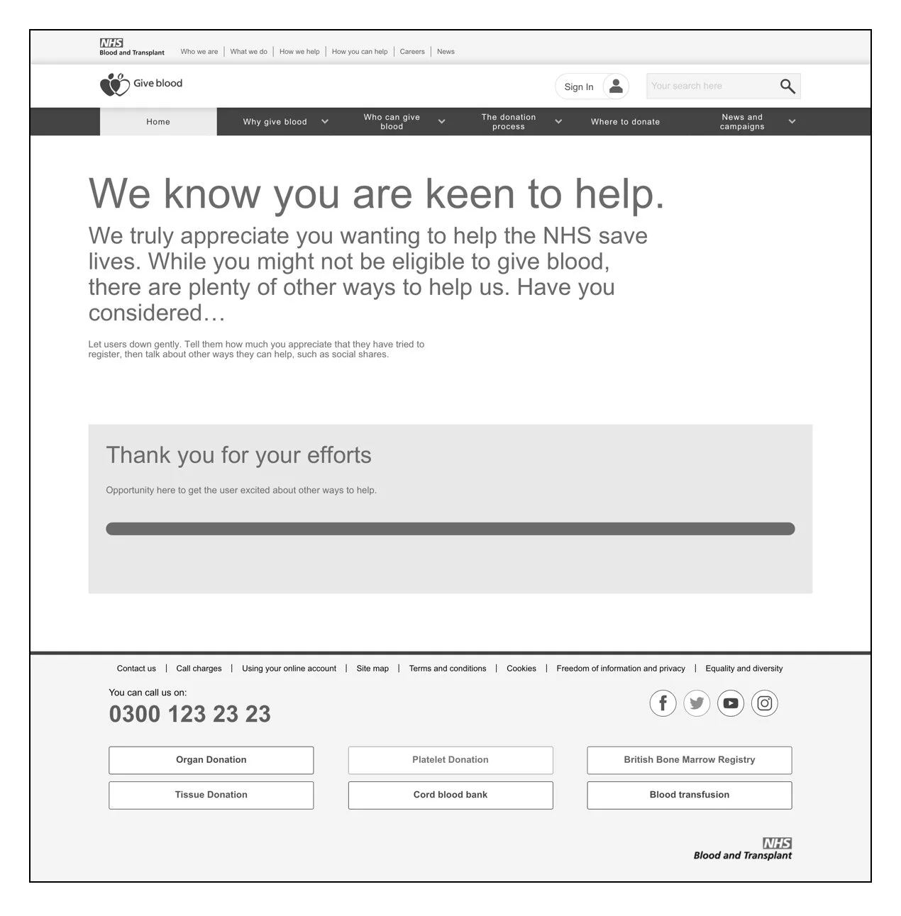 In early designs, all users who were not eligible to donate based on their selections on step one were taken to the same generic rejection page, in later iterations these were personalised by reason for non eligibility, managing any disappointment, thanking them for coming forward and providing them with other ways to help the NHS.